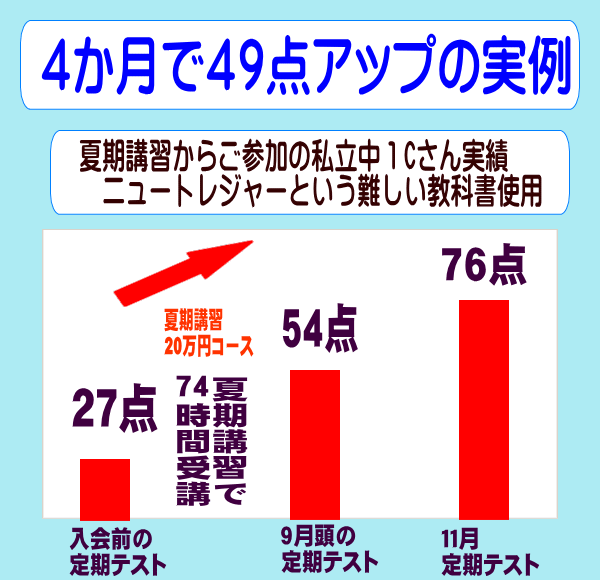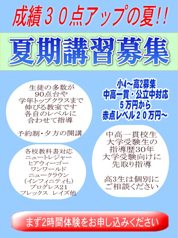 | 福岡市の英語塾 夏期講習 成績を本当に上げたい場合、集中的に大量学習しないとそう簡単に成績アップはできません。 上記の実例のように、成績アップできるのは、大量学習と、家庭からのネットドリルで学習の定着をはかっているからです。まじめな学習姿勢がなければ、このような成果は出せません。 インターネットでのドリル練習は、毎日確実に練習をお願いします。 体験授業の前に、「試験の女神」ドリル無料試用コーナーで練習してご確認の上、ご参加ください。 宿題はこのネットドリルが出ますので、できるだけたくさん練習してからおいでください。 |